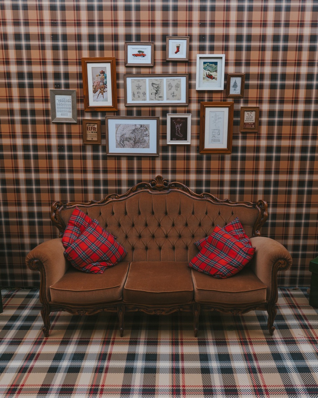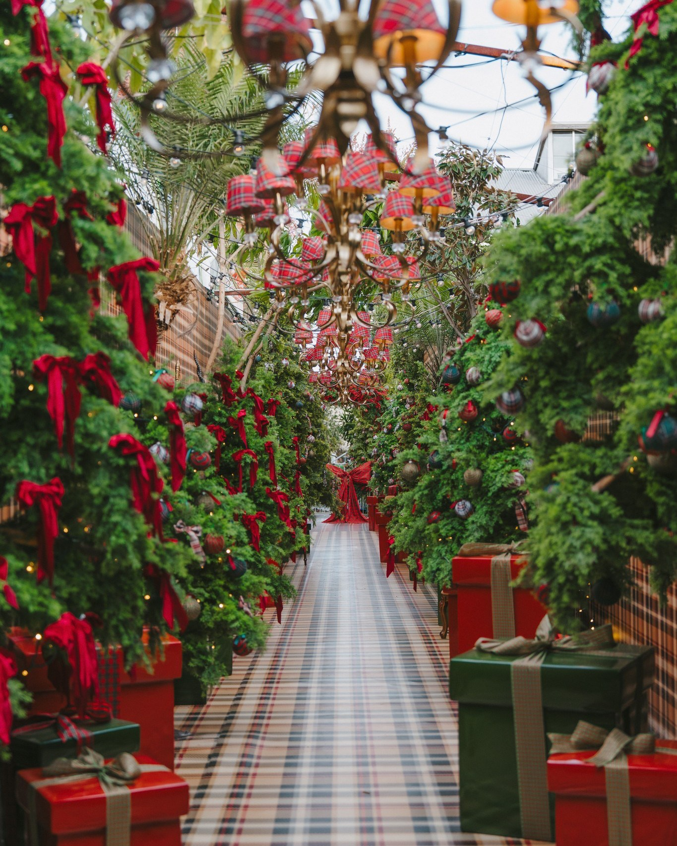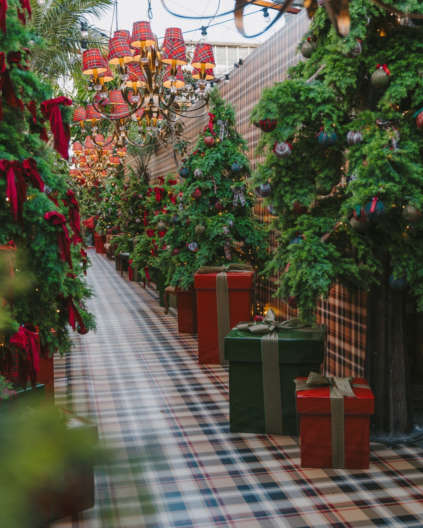 The Tartan Christmas Laneway at The Grounds of Alexandria is designed to transport visitors into a scene reminiscent of London or Edinburgh during Christmas. Every corner has been meticulously decorated to create a cohesive, festive environment, blending classic tartan patterns, red bows, and warm golden lights.