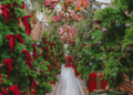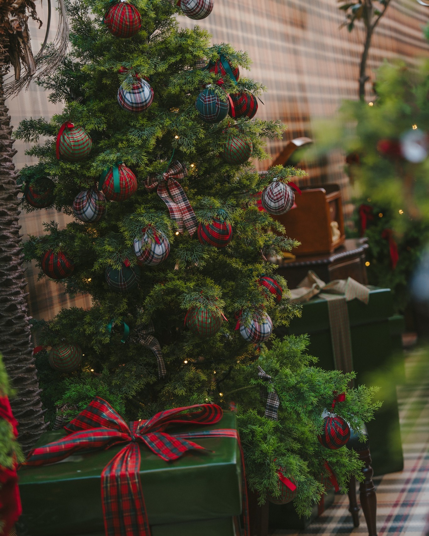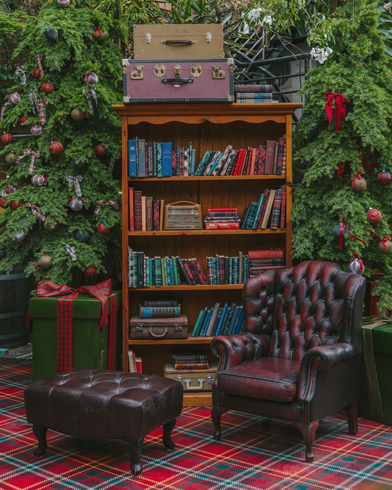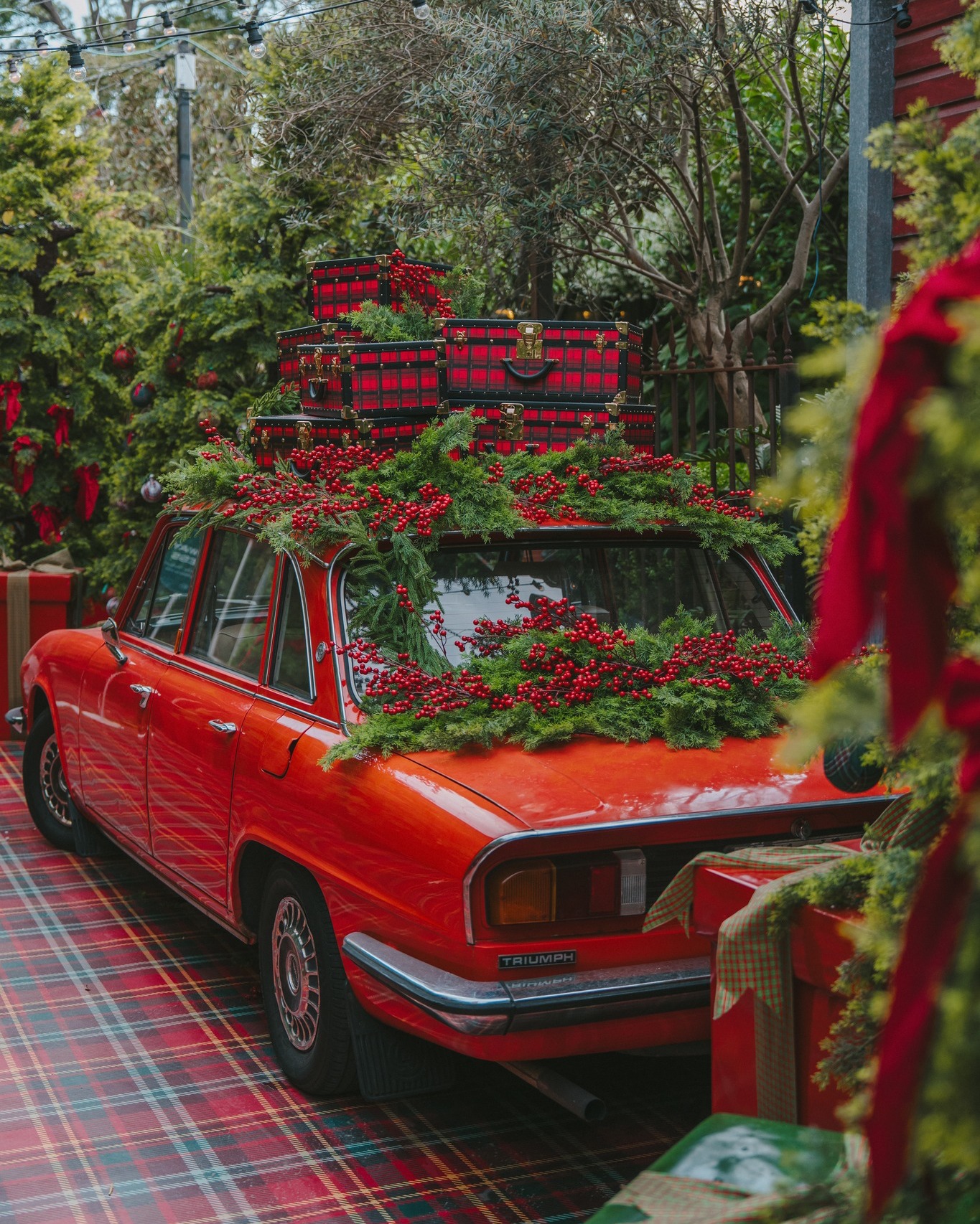 The Tartan Christmas Laneway at The Grounds of Alexandria is designed to transport visitors into a scene reminiscent of London or Edinburgh during Christmas. Every corner has been meticulously decorated to create a cohesive, festive environment, blending classic tartan patterns, red bows, and warm golden lights.